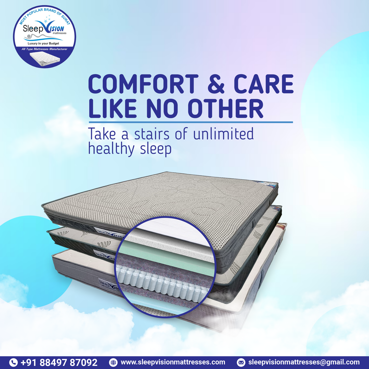 This mattress contain pre-stresses springs inserted into individual fleece or cotton pockets and then clipped among one another or glued on top, middle or bottom. It is the point-by-point elasticity that distinguishes itself from others. The greater number of springs allows more flexibility so that mattress can better to body shape.